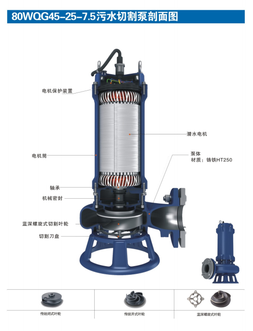 WQG污水切制泵切割部分具有独特的螺旋式结构及带锋利刀口设计,在保证水利性能的高效且超过同类产品的前提下,又具有一定的切割能力,保证稻草、棉、布、婴儿尿不湿等废弃物切碎后排出的优越切割功能。