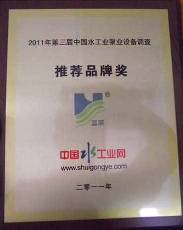 蓝深集团自成立以来,一直秉承了客户第一的方针,我想这才是使我们今天获得这样的奖项:在2 011年第三届中国水工业泵业设备调查,获得“推荐品牌奖”。在今后的过程中,我们将以这次奖项为契机,鞭策我们向更快更好的方向发展,为广大客户提供质量更好、品质更优、技术含量更高、更优秀的服务,以此来回报社会、回报各界朋友对我们的信任和厚爱。