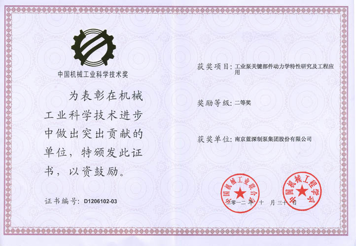 热烈祝贺南京蓝深集团2012年度获得10项科技奖“高扬程无过载潜水排污泵关键技术研究与产业化 ” 获得江苏省科学技术奖二等奖